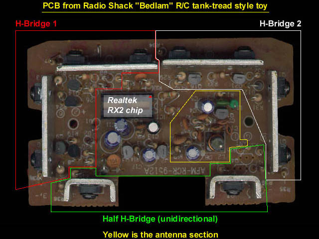 Beneath the Bedlam is a set of 4 wheels that pop down when the user presses 'left' or 'right' on the remote. This is a bi-directional channel, but note that when this channel is activated, the treads are disabled (the left/right wheels pick them up off the ground anyways). For my project I've disconnected the center motor from the circuit board, and I moved the BLUE tread wires to the center motor's circuitry. This makes the tread bi-directional, but the circuitry disables the RED tread when BLUE is on. To disable the interlock that shuts off Motor 1 & 3 when Motor 2 is on, remove diodes D3 & D4. In the 'parts side' photo, these are just above the 'R' in Realtek. The cathode ends of these are tied together and the trace is held to ground through a 56K resistor (except when pin 6 or 7 of the chip are on). This signal then goes through 3 10K resistors to 3 transistors, one in each Half H-bridge that gets disabled. |