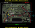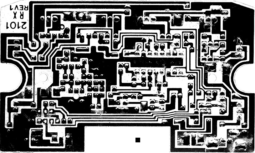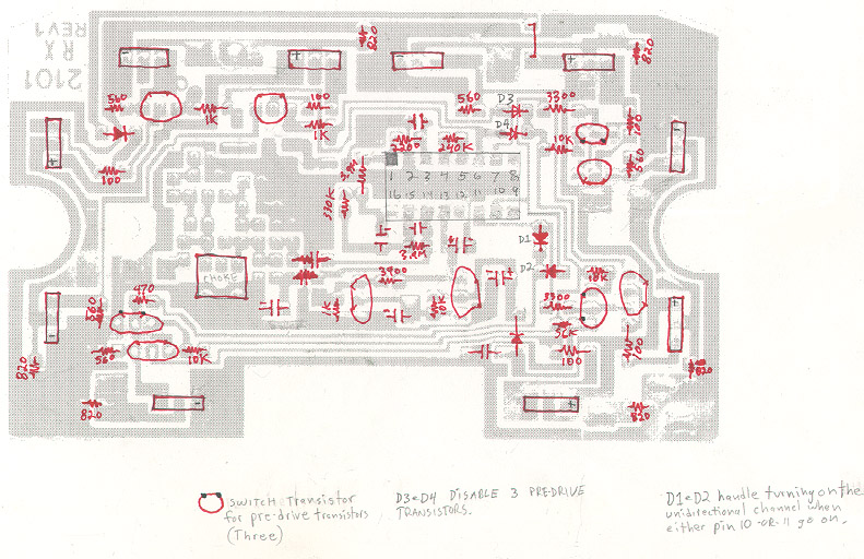 This is a scan of the copper side, lightly printed, and some parts drawn on top of that. It really helps to understand the circuit. Click on the thumbnail to see the annotated drawing. Other versions: color, black & white, and light gray (for printing). |