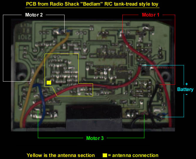 A photo of the solder side, with pointers to the motor connections. Here you can see I've moved one of the tread motors (the yellow and blue wires) from the Motor 3 connections to the Motor 2 connections for bi-directional control. |
